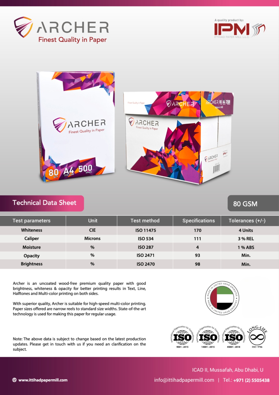 Archer is an uncoated wood-free premium quality paper with good brightness, whiteness & opacity for better printing results in Text, Line, Halftones and Multi-color printing on both sides.